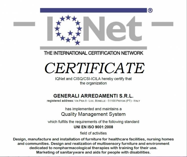 "GENERALI ARREDAMENTI SRL, PRIMA AZIENDA ITALIANA CERTIFICATA ISO 9001:2008 PER PROGETTAZIONE E RE [...]