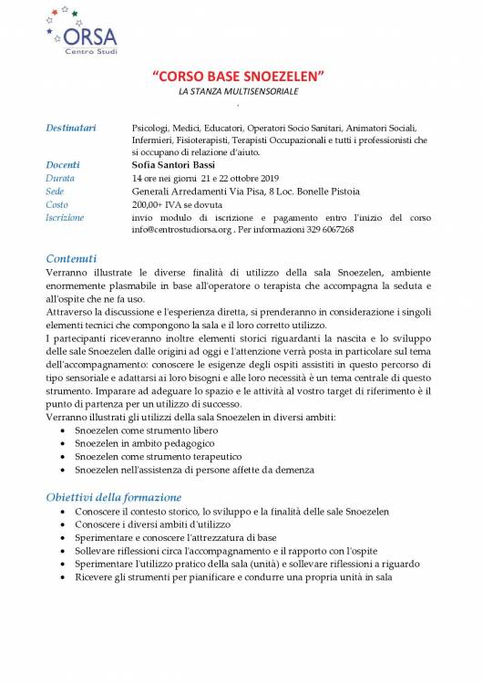 La formazione proposta prevede una alternanza di momenti teorici in classe centrati principalmente sulla filosofia che accompagna lo Snoezelen e che affronteranno anche il tema della sensorialità, con momenti di pratica in sala. Docente Sofia Santori Bassi formatrice del Centro Sfera Bianca certificata ISNA MSE. Le giornate formative si svolgeranno presso la sede rinnovata di Generali Arredamenti, via Pisa, 8 - Pistoia, dove è stata realizzata una stanza per la terapiavibroacustica, dove è possibile sviluppare e utilizzare tutti i sensi. Trattasi si importante occasione di crescita professionale per operatori del sociale e per coloro che operano con personefragili. Di seguito riepilogo contenuti del corso e la scheda di iscrizione.
