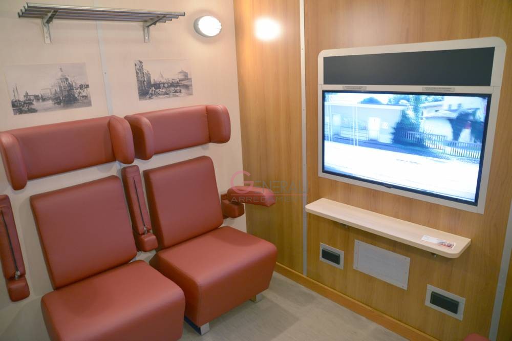 All’interno sono previste oltre le poltrone con poggiatesta, quattro immagini di città , due porta valige in acciaio , quattro lampade da lettura a parete , una lampada centrale, e un rilevatore di fumo (non attivo) inoltre sia a soffitto che sotto il monitor finestrino sono presenti griglie di aereazione, il monitor finestrino , generalmente da 50 pollici , è contestualizzato all’esterno della parete consentendo una lettura del viaggio in prospettiva e riquadrato con profili a L e nella parte sottostante una mensola di appoggio. E’ possibile applicare un tavolino a ribalta e tendine parasole. Viene inoltre realizzato un piccolo vano tecnico retro-tv, accessibile da una porta invisibile nel fronte centrale dove è posizionato il sistema salvavita impiantistico e dove può essere allestita una postazione per l’operatore per la videoregistrazione dei viaggi.
