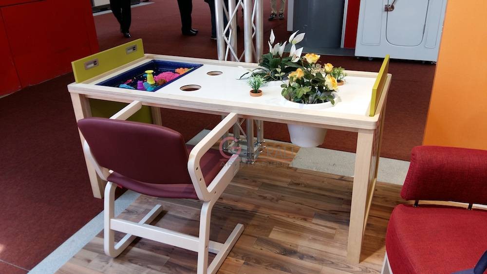 Per questi trattamenti fatti da professionisti alcuni ambienti possono essere strutturati con lo scopo di facilitare il loro lavoro, in questo contesto abbiamo realizzato il tavolo polivalente per attività, un elemento unico, che possiamo utilizzare per terapia della sabbia, per giochi di società, dama, monopoli, tombola, ecc… Abbinato alla parete verde diviene un tavolo per attività orto terapiche da svolgersi all’interno.