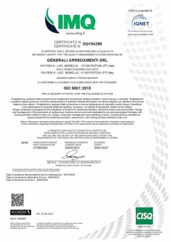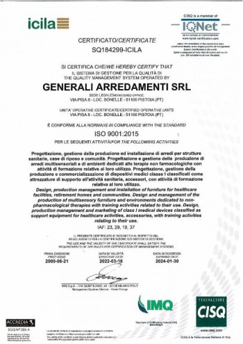 La Generali Arredamenti, prima azienda certificata ISO per "Progettazione, produzione ed installazione di arredi per strutture sanitarie, case di riposo e comunità. Progettazione e realizzazione di arredi multisensoriali e di ambienti dedicati alle terapie non farmacologiche con attività di formazione relative al loro utilizzo. Commercializzazione di sanitari ed ausili per disabili."