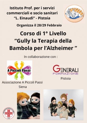 Generali Arredamenti Srl divisione Formazione - Associazione A piccoli passi di Siena - - Istituto Luigi Einaudi di Pistoia presentano: Il corso di formazione "Gully la Terapia della Bambola" dedicato agli studenti delle scuole superiori con indirizzo socio-sanitario. L’Istituto Professionale di Stato per i Servizi Commerciali e Socio Sanitari “Luigi Einaudi” è la prima scuola in provincia di Pistoia ad avviare una formazione per studenti sulle Terapie non Farmacologiche utili nel trattamento delle demenze e patologia Alzheimer. Il 28 febbraio, in occasione dell´inizio del corso, sarà presente il Vicesindaco di Pistoia Anna Maria Celesti per condividere la rilevanza del progetto, e rimarcare l’eccellenza delle scuole che credono nella preparazione dei propri studenti ad un approccio innovativo e validato per la gestione delle persone con Alzheimer. Un’ importante esperienza di Formazione per i ragazzi, ai quali alla fine del corso verrà rilasciato attestato di partecipazione I Livello per la somministrazione della Terapia della Bambola Dispositivo Medico.