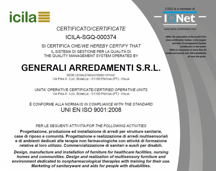 "GENERALI ARREDAMENTI SRL, PRIMA AZIENDA ITALIANA CERTIFICATA ISO 9001:2008 PER PROGETTAZIONE E REALIZZAZIONE DI AMBIENTI MULTISENSORIALI E FORMAZIONE DEDICATA"